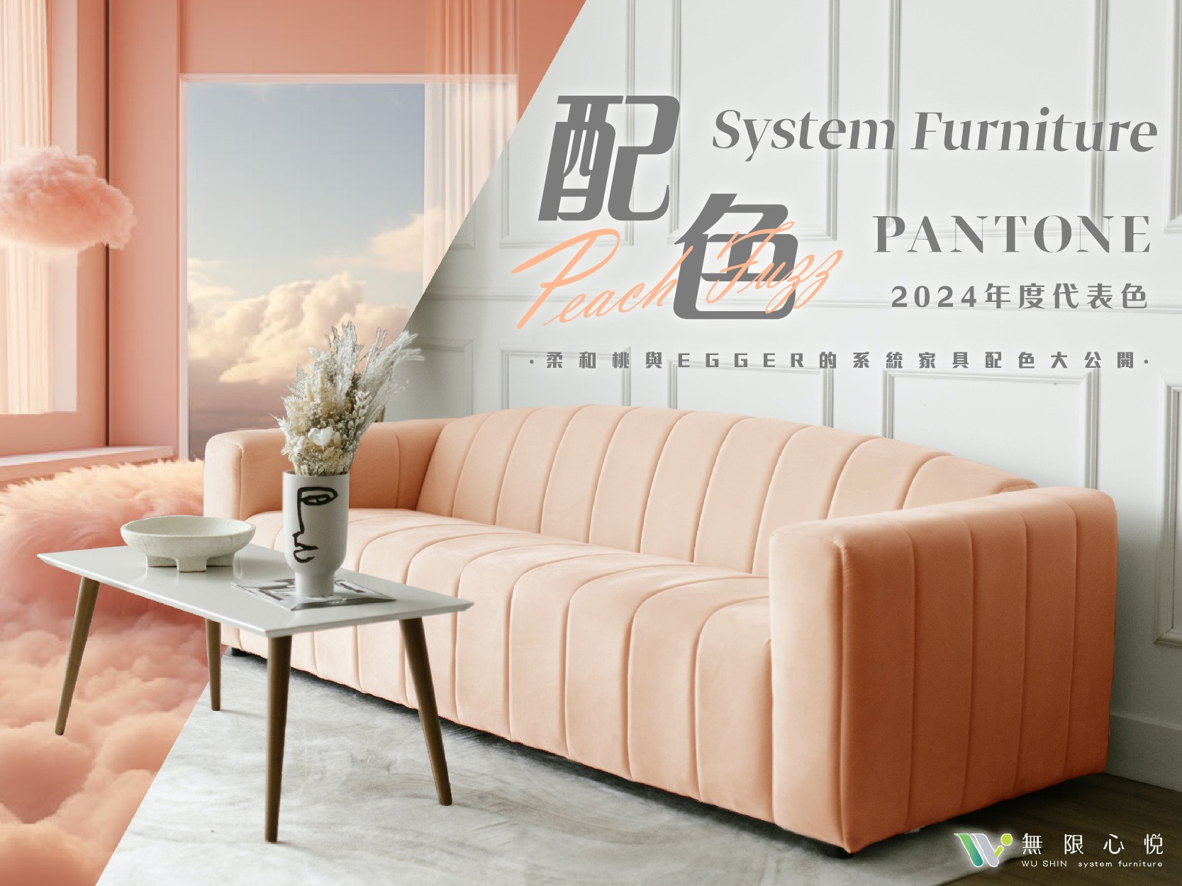 PANTONE(彩通)為研究色彩而聞名全球的權威機構,提供設計界專業色彩選擇和精確的交流語言。在每一年選出具有象徵性的年度代表色,皆成為該年度引領設計趨勢的流行色彩;而2024年度代表色:PANTONE 13-1023 Peach Fuzz(柔和桃)是介於粉色與橘色之間的淺柔暖色,那該如何將它運用在系統家具上呢?