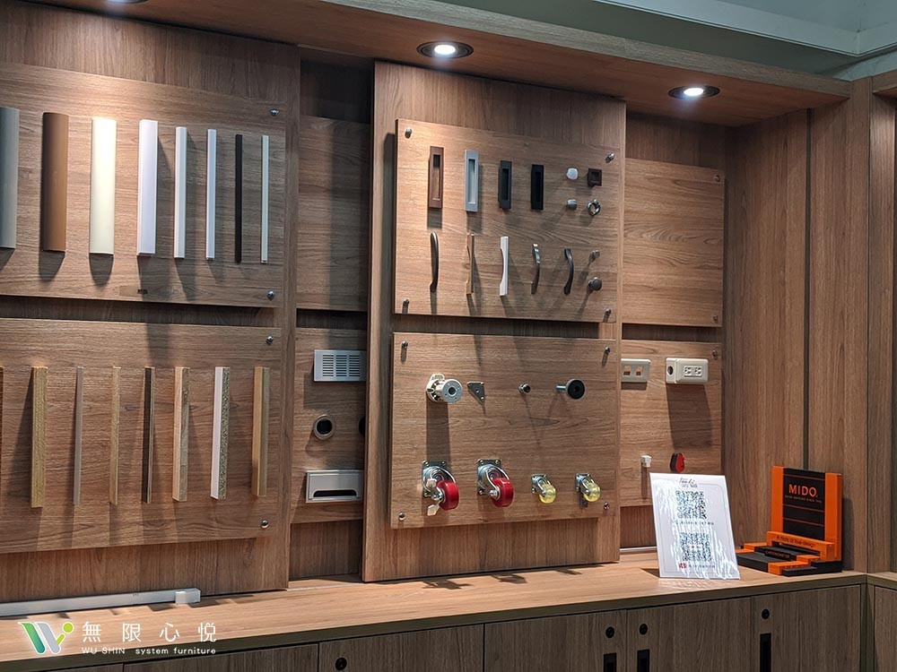 五金展示區,含五金、板材、面材、LED等,讓公司內部設計師可以迅速找到五金樣本,畢竟五金對於一個系統櫃來說算是重點之一,完全可以決定一個系統櫃的好壞與價格高低,所以千萬不能馬虎,經由設計師親眼所看,運用在客戶的需求上,才不會有一絲一毫的誤差。以及明顯的分類陳列,不需要翻箱倒櫃,讓設計師一眼就可以找到需要的材料。也特地為了板材、面材部分採用滑動式設計,能輕易替換板材,也不影響陳列效果。