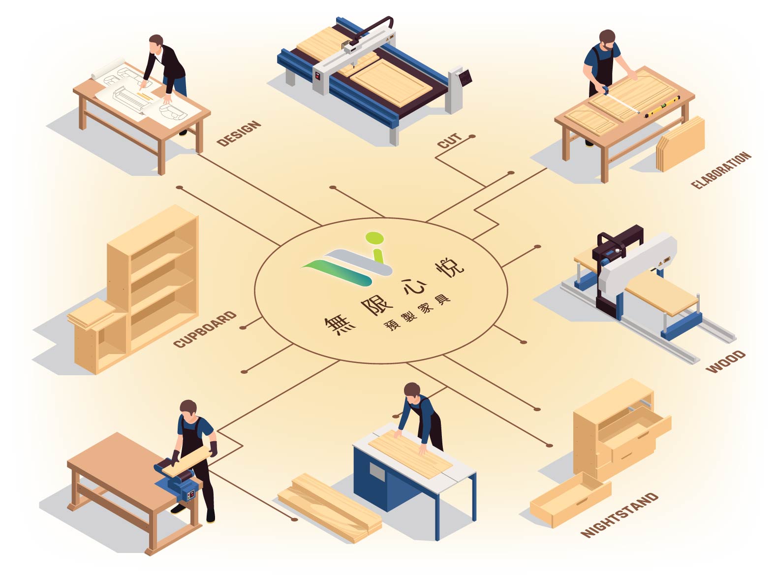 透過設計來銷售產品,提供定製化以及客製化服務;使用的是歐洲進口的五軸加工機,以自動化製程做到高品質、低體積、好運送,亦提供異形封邊等多樣功能,可以將設計師設計的作品完美展現出來,以及與EGGER、富美家合作,提供多樣化高級環保板材。